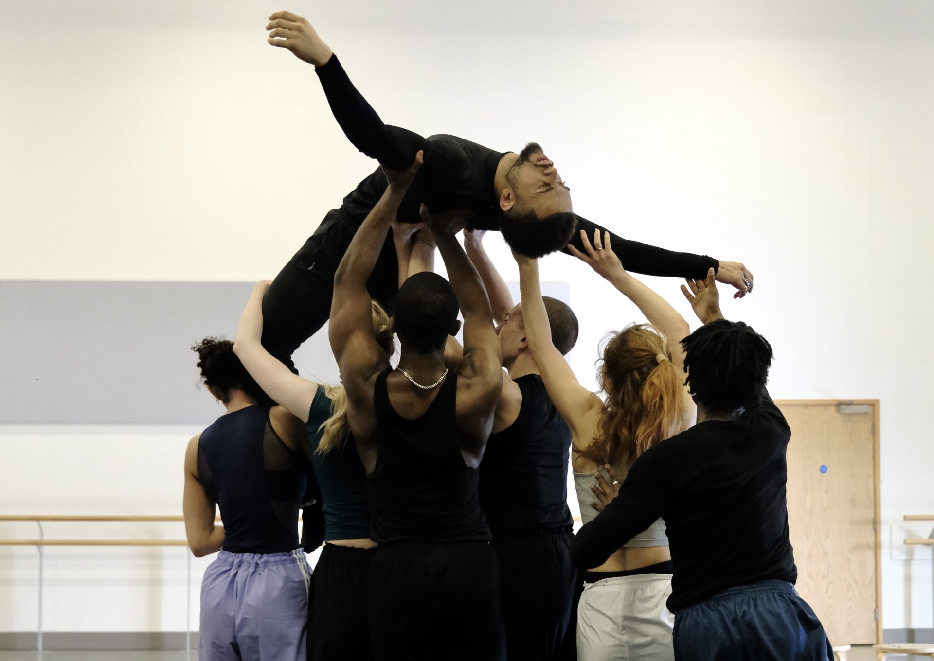 (1) Company Dancers with Teige Bisnought elevated; (2) Dane Hurst in rehearsal with Hannah McGlashon; (3) Company Dancers; (4) Dorna Ashory; (5) Dane Hurst directing Requiem in rehearsal; (6) Carina Howard (elevated) and Hannah McGlashon; (7) Mbulelo Ndabeni (Rehearsal Director); (8) Yasmina Patel (foreground) and Company Dancers.